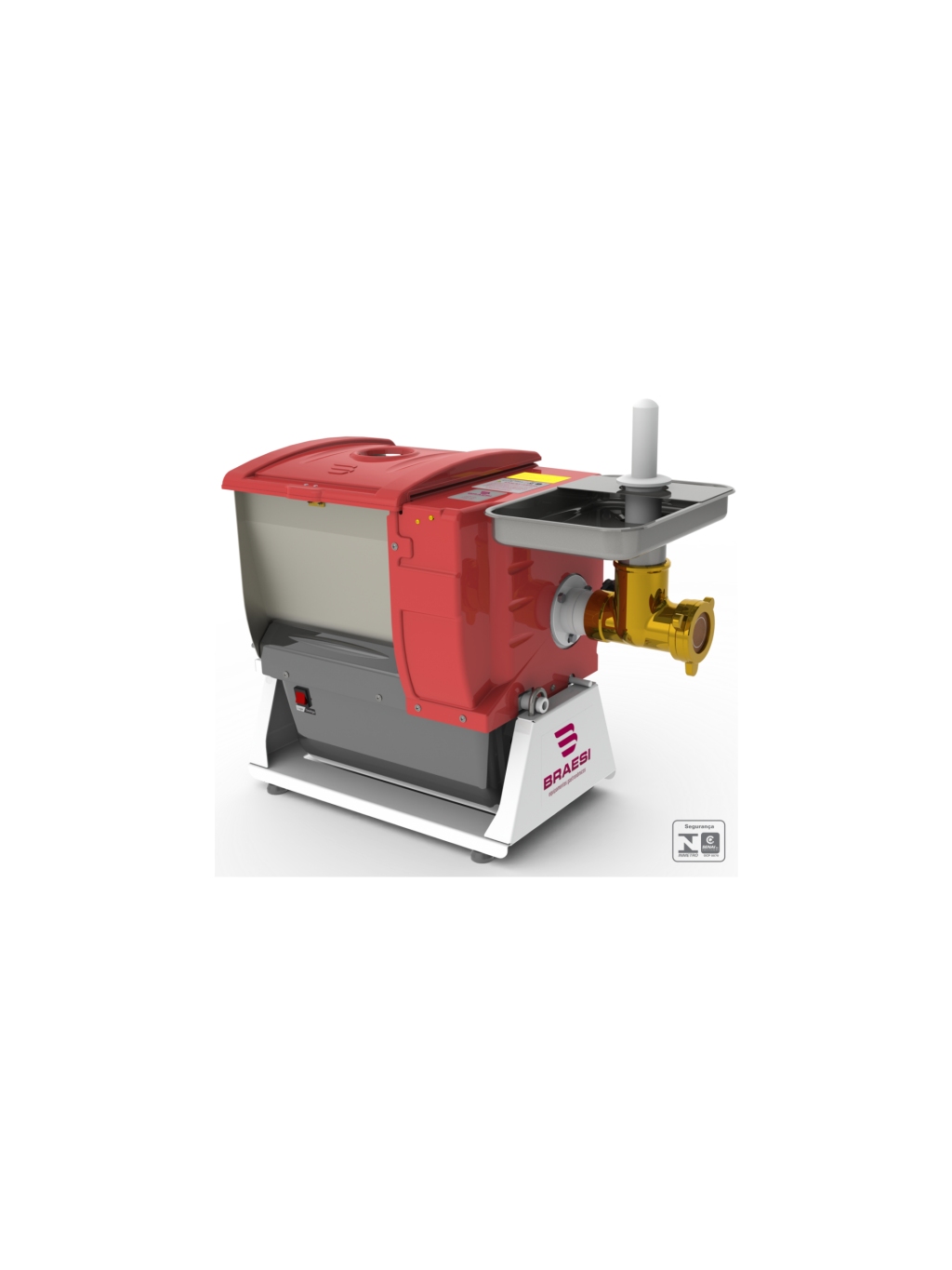 Opcionais: kit para moer carne, pino central, navalha, chapa, bocal 9 em ferro fundido com banho de estanho e bandeja em aço inox.